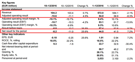 【中國涂料采購網】2月9日,芬蘭迪古里拉(Tikkurila)發布了2016年度報告,報告顯示,2016年全年實現銷售收入為5.72億歐元,同比下降2.1%。營業利潤(EBIT)為5310萬歐元,同比下降13.9%。凈利潤為4450萬歐元,同比增長7.2%。
