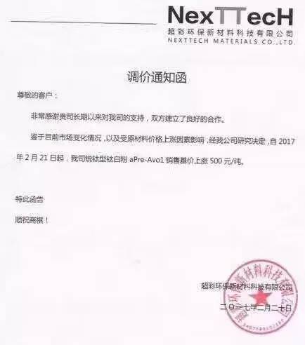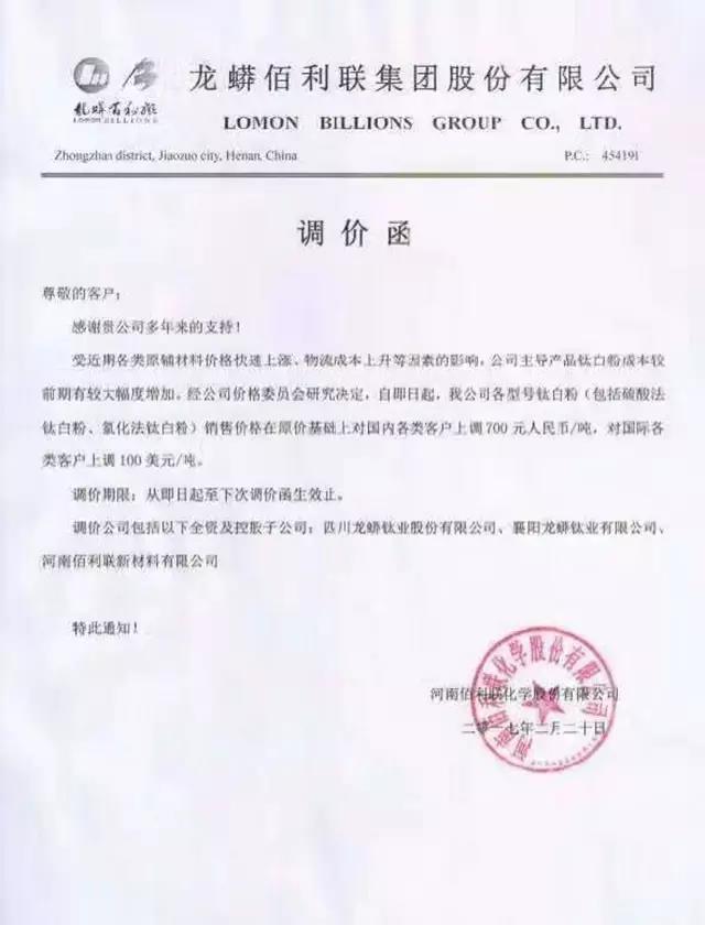 【中國涂料采購網(wǎng)】佰利聯(lián)(002601)2月20日晚間公告,受近期各類原輔材料價格快速上漲、物流成本上升等因素的影響,公司主導產(chǎn)品鈦白粉成本較前期有較大幅度增加。自即日起,公司各型號鈦白粉(包括硫酸法鈦白粉、氯化法鈦白粉)銷售價格在原價基礎上對國內(nèi)各類客戶上調(diào)700元人民幣/噸,對國際各類客戶上調(diào)100美元/噸。