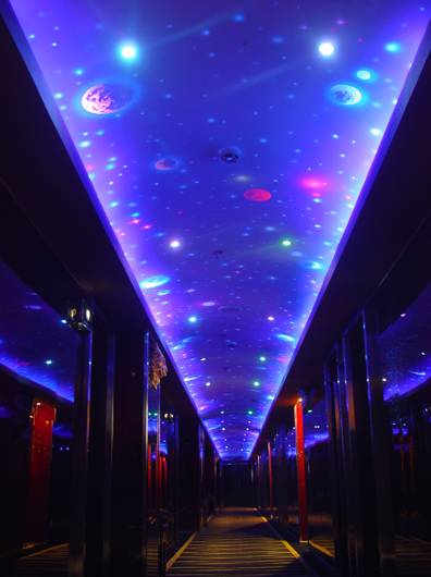 這時候打開紫光燈,奇跡出現(xiàn)了——原來的白墻上,出現(xiàn)了繽紛絢爛的瑰麗光影。