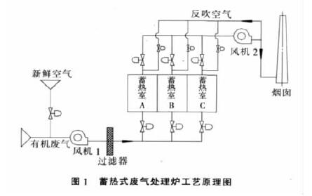 RTO設(shè)備的工作原理見圖1。該設(shè)備有3個對稱的蓄熱室和2個燃燒室,有機(jī)廢氣在鼓風(fēng)機(jī)作用下先進(jìn)入陶瓷蓄熱室A,吸熱后進(jìn)入燃燒室,蓄熱室A因放熱而降溫,燃燒升溫后的氣體進(jìn)入蓄熱室B,通過熱交換把熱量蓄存在蓄熱室B的陶瓷蓄熱體中,然后排出。同時蓄熱室C空間中殘留未處理有機(jī)廢氣被凈化后的氣體反吹回燃燒室進(jìn)行焚化處理。經(jīng)過一定時間(約2min)后,氣流改變方向從蓄熱室B進(jìn)入燃燒室,通過蓄熱室B吸收熱量升溫后,在爐膛內(nèi)高溫焚化,最后經(jīng)蓄熱室C熱交換后排放,同時蓄熱室A處于反吹掃狀態(tài),經(jīng)一定時間(約2min)后,氣流再改變方向,不斷地交替循環(huán),保證燃燒室溫度在800°C以上,從而保證高的去除率和換熱效率。
