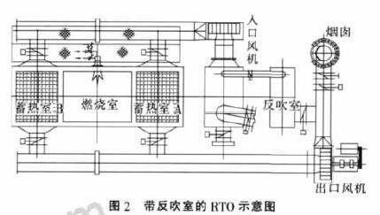 換向周期短,換向過程中有廢氣外排的現(xiàn)象,為解決這一問題,最佳方式為3室RTO,但造價昂貴,為解決這一難題,采用2室RTO的同時減少外排。設(shè)計了一種基于2室同時增加反吹功能的RTO,就是2室RTO加上反吹室,見圖2。