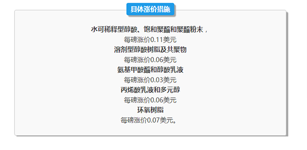【中國涂料采購網(wǎng)】美國Reichhold公司宣布,將對公司出產(chǎn)的所有溶劑型醇酸樹脂、水稀釋型醇酸樹脂及共聚物、醇酸乳液、丙烯酸乳液、多元醇、聚氨酯、環(huán)氧樹脂、飽和聚酯和聚酯粉末涂料樹脂等產(chǎn)品進(jìn)行漲價,本次漲價范圍適用于在美國和加拿大銷售的所有產(chǎn)品,涉及2017年3月20日當(dāng)天或之后發(fā)貨的所有訂單。