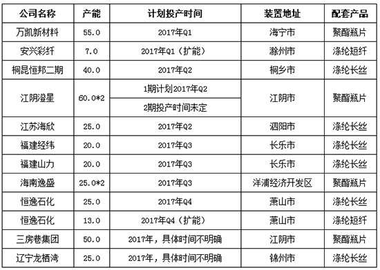 2017年1-12月聚酯裝置投產(chǎn)動態(tài)