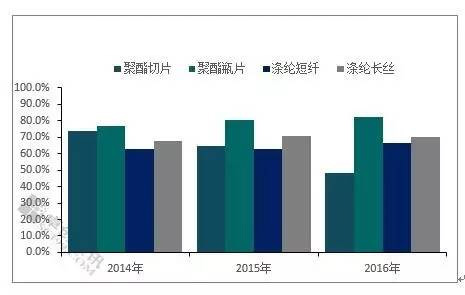 從最近三年的數(shù)據(jù)來看,2014-2016年,聚酯切片、滌綸短纖、滌綸長絲、聚酯瓶片平均開工率分別為62.1%、64.1%、69.6%、79.7%。其中,聚酯瓶片開工率保持在相對高位,主要是經(jīng)濟(jì)波動對大量使用聚酯包裝的快速消費(fèi)品行業(yè)影響相對較小,為聚酯瓶片提供了穩(wěn)定的下游市場基礎(chǔ)。與此相比,由于紡織服裝行業(yè)不景氣,導(dǎo)致聚酯切片、滌綸短纖、滌綸長絲開工率嚴(yán)重不足,其中聚酯切片開工率表現(xiàn)最差又有切片紡市場份額萎縮的原因。