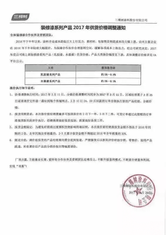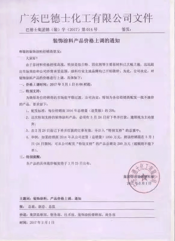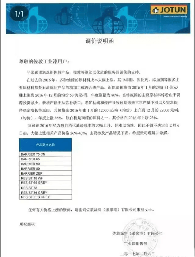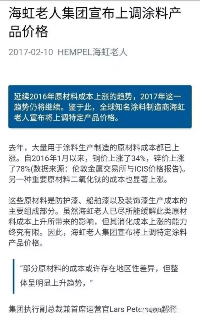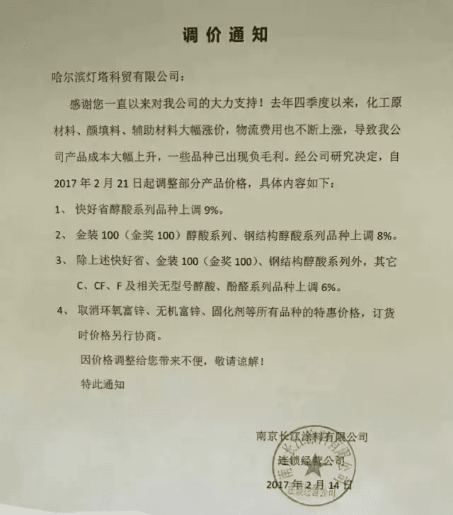面臨原材料持續不斷地漲價,涂料企業忍氣吞聲地度過了2016年,2017年,原材料漲價依然猛烈,已經有相當一部分的涂料企業已經到了虧損的邊緣,已經到了不漲就死,漲了就丟客戶的尷尬境地。近日行業內的帶頭大哥終于出現了,這次這幾家行業的龍頭企業帶動涂料企業漲價,很快會引發行業內的骨牌效應,帶動國內的大批其他涂料企業跟進。