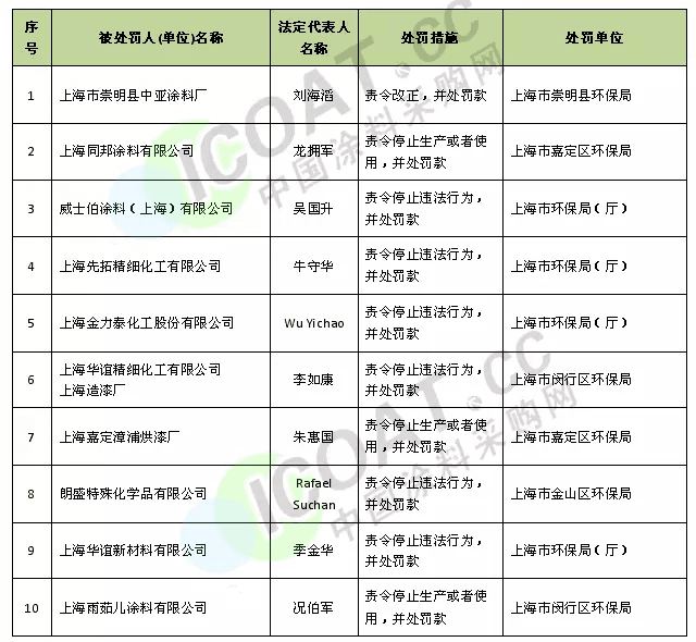 【中國涂料采購網】近日,上海市環保廳公布了一批違規被罰企業名單,其中和涂料相關的企業有10家,這些企業因違反《中華人民共和國環境保護法》和《上海市環境保護條例》等有關法律法規,而被環保廳重罰,其中,有不少外資企業上榜,如威士伯涂料(上海)有限公司、上海金力泰化工股份有限公司、朗盛特殊化學品有限公司等,經中國涂料采購網整理,其名單公布如下: