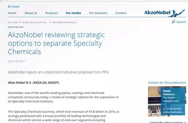 阿克蘇諾貝爾公司確認,PPG工業集團對阿克蘇諾貝爾的全面股本公開做出了事先未經商議,非約束性且有前提條件的收購要約,收購阿克蘇諾貝爾每股對價為現金54.00歐元外加0.3股PPG工業股票 (相當于2017年2月28日每股價格為83.00歐元,含2016年股息)。