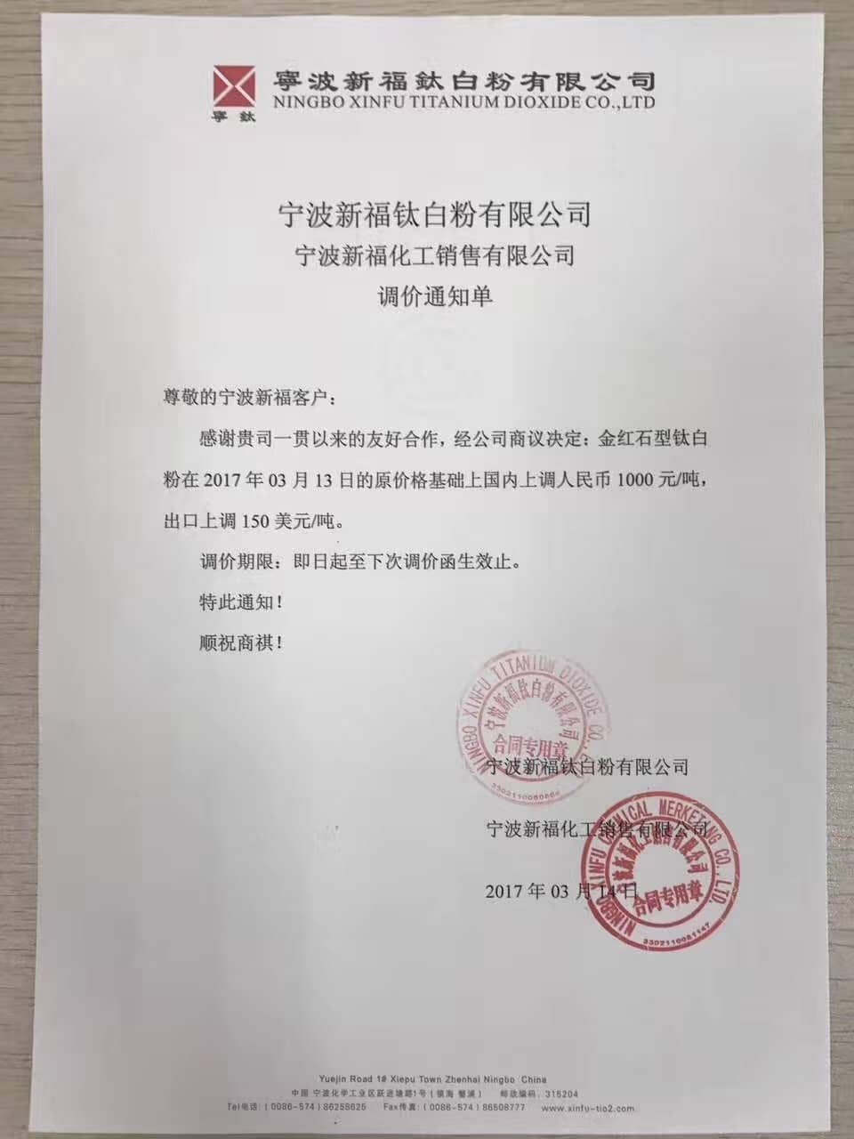 寧波新福有限公司對(duì)鈦白粉上調(diào)1000元/噸