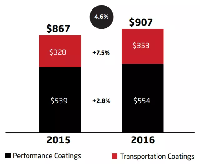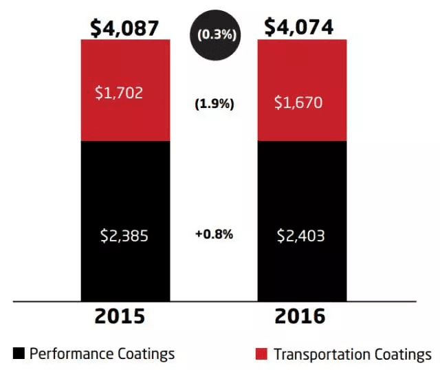 艾仕得交通運(yùn)輸涂料部門,2016財年凈銷售額為16.70億美元,同比下降1.9%。該部門為輕型商用車的OEM提供先進(jìn)的涂層技術(shù)。其終端市場為輕型車、商用車。