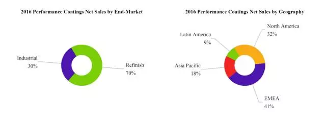 財報顯示,按銷售額來看,汽車修補(bǔ)漆、工業(yè)涂料銷售額占高性能涂料部門比分別為70%、30%。按地理來看,EMEA(歐洲、中東和非洲)、北美地區(qū)、亞太地區(qū)、拉丁美洲地區(qū)的銷售額分別占比為41%、32%、18%、9%。