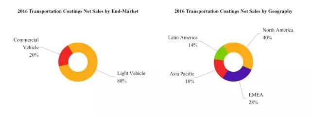 財報顯示,按銷售額來看,輕型車、商用車銷售額占交通運(yùn)輸涂料部門比分別為80%、20%。按地理來看,EMEA(歐洲、中東和非洲)、北美地區(qū)、亞太地區(qū)、拉丁美洲地區(qū)的銷售額分別占比為28%、40%、18%、14%。
