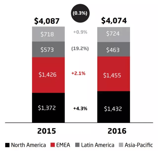 財報顯示,艾仕得在EMEA(歐洲、中東和非洲)、北美地區(qū)、亞太地區(qū)、拉丁美洲地區(qū)的銷售額分別為14.314億美元、14.553億美元、7.239億美元、4.629億美元。