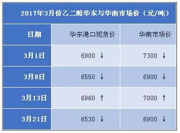 2017年3月份乙二醇華東與華南市場(chǎng)價(jià)(元/噸)