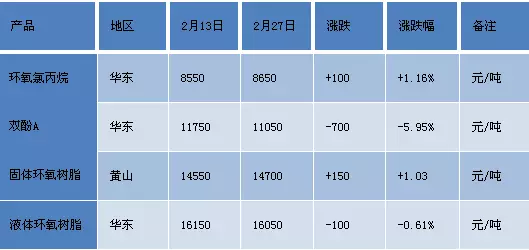 從上表環(huán)氧樹(shù)脂主要原料及樹(shù)脂價(jià)格的對(duì)比可以看出,原料雙酚A跌勢(shì)明顯,另一原料環(huán)氧氯丙烷價(jià)格較為堅(jiān)挺,而固體與液體環(huán)氧樹(shù)脂價(jià)格出現(xiàn)不同程度的下跌。