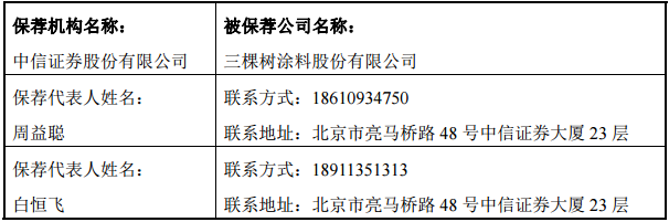 四、其他事項 2017 年 2 月 25 日起,三棵樹的保薦代表人之一史建杰先生因工作變動,將不再負責公司本次發行持續督導工作。為保證持續督導工作的有序進行,中信證券委派保薦代表人白恒飛先生接替史建杰先生履行持續督導職責。本次變更后,公司的保薦代表人為周益聰先生和白恒飛先生,持續督導期至 2018 年 12 月 31 日止。