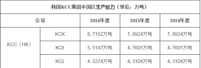 目前,韓國(guó)KCC集團(tuán)在中國(guó)擁有昆山、北京、廣州、重慶4家工廠——金剛化工(昆山)有限公司(KCK),金剛化工(北京)有限公司(KCB),金剛化工(廣州)有限公司(KCG),以及2016年成立的金剛化工(重慶)有限公司。2007年11月設(shè)立KCC化學(xué)(香港)控股有限公司。