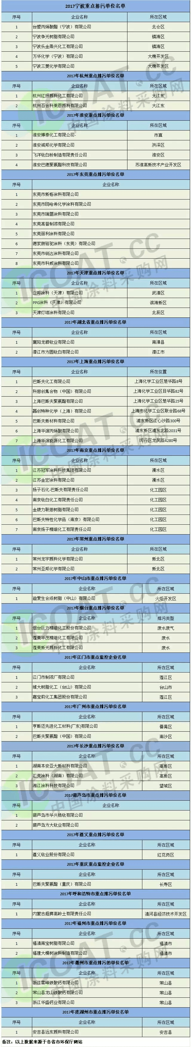 2017年各省市重點排污涂料原材料部分企業名單匯總