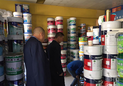 今天早上,西安工商雁塔分局朱雀南路工商所的工作人員,對三森建材城周邊的涂料市場進行了突擊檢查,對兩家商戶的違規經營行為進行了整改,查獲了4桶嫌商標侵權的涂料產品。對于這些產品,工商部門會進行暫扣,并對涉事商戶進行處理。