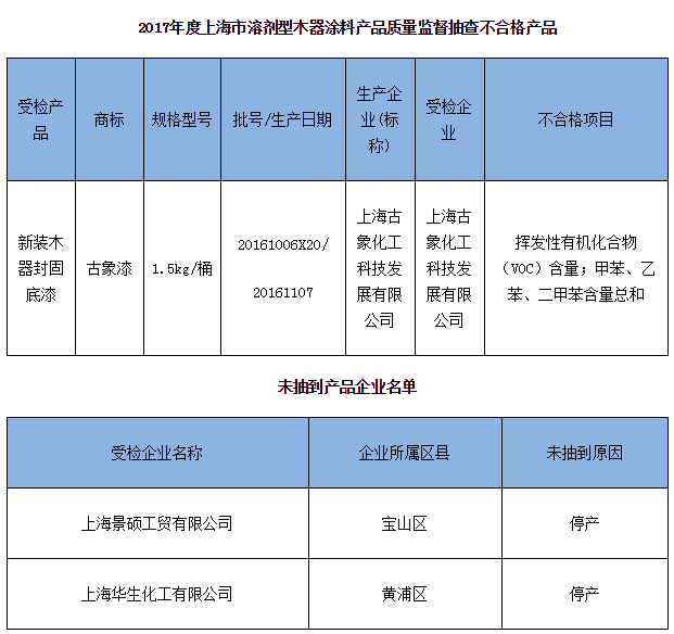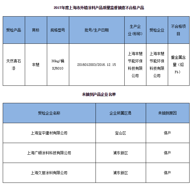 本次抽查發(fā)現(xiàn),上海古象化工科技發(fā)展有限公司生產(chǎn) (標(biāo)稱)的1批次“古象漆”新裝木器封固底漆(1.5kg/桶 20161006X20/ 20161107)不合格,涉及的不合格項目為揮發(fā)性有機化合物(VOC)含量和甲苯、乙苯、二甲苯含量總和。據(jù)本次發(fā)布的《2017年度上海市外墻涂料產(chǎn)品質(zhì)量監(jiān)督抽查不合格產(chǎn)品》名單,上海豐慧節(jié)能環(huán)保科技有限公司生產(chǎn) (標(biāo)稱)的1批次“豐慧”天然真石漆(規(guī)格型號:30kg/桶 DJ6010 ;批號/生產(chǎn)日期:2016012003/2016.12.15)不合格,涉及的不合格項目為重金屬含量(鉛Pb)。