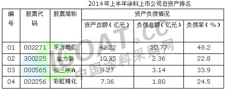 在以往的分析當中,我們只對上市涂料企業(yè)的凈利潤進行了詳細的介紹分析,因為凈利潤往往能反映出一個公司的盈利情況,這往往是人們最為關(guān)心的問題。上表我們對2014年上半年涂料上市公司總資產(chǎn)進行了排名。通過上表,我們可以看出,2014年上半年在全國四家涂料生產(chǎn)企業(yè)當中,東方雨虹以42.22億元的總資產(chǎn)獨占鰲頭,其次則是金力泰,其總資產(chǎn)為10個億,與東方雨虹相差甚遠。而作為第三、第四的渝三峽A和彩虹精虹則相差并不是很大。