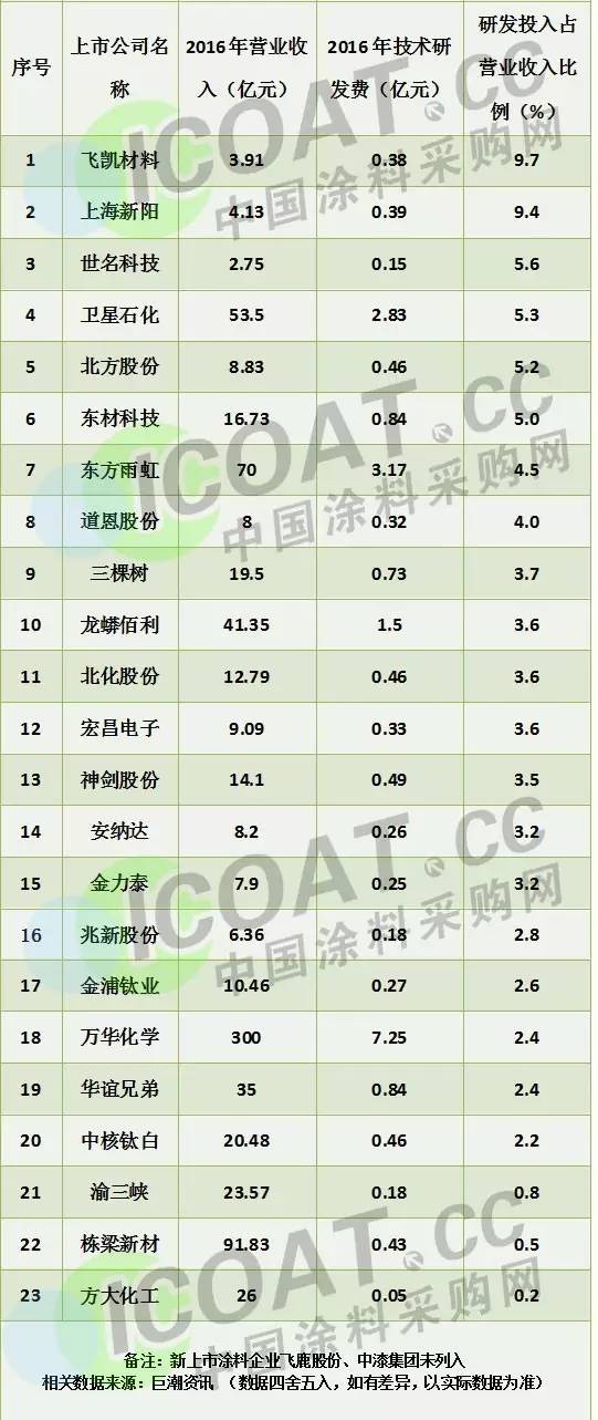 涂料及上下游原材料上市公司研發投入占營業收入比例排名