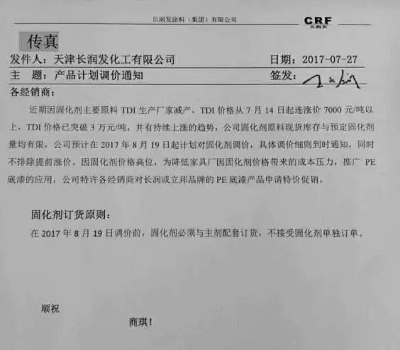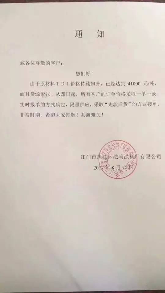 每一次原材料的暴漲,都導致涂料行業壓縮利潤空間,做為下游,涂料企業怕失去市場份額,通常都不敢明目張膽地漲價。有些企業只是在暗地里對中小型客戶、代理商等人偷偷漲價。但是,此次原材料的漲價潮來勢兇猛。TDI、鈦白粉、樹脂、助劑等原材料的價格暴漲讓涂料企業面臨巨大的成本壓力,日前,立邦、佐敦這樣的涂料巨頭已經受不了,對產品價格進行了跟漲。還有艾仕得、百川、米奇、仕全興、華洋化工、法美涂料廠、金展鴻等涂料企業紛紛集體下發了調價通知。