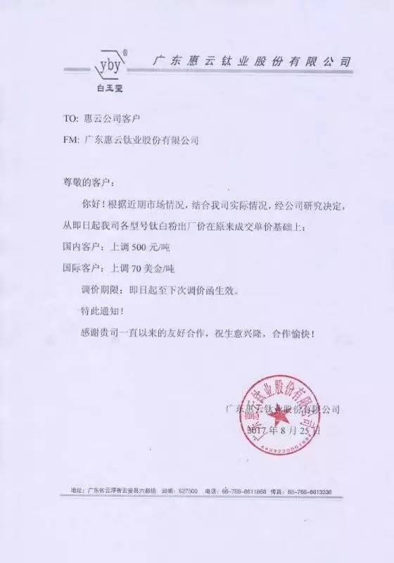 8月25日,廣東惠云鈦業股份有限公司發布漲價通知,通知稱,根據近期市場情況,結合實際情況,決定從即日起,各型號鈦白粉出廠價,在原來成交單價上,國內客戶上調500元/噸,國際客戶上調70美金/噸。