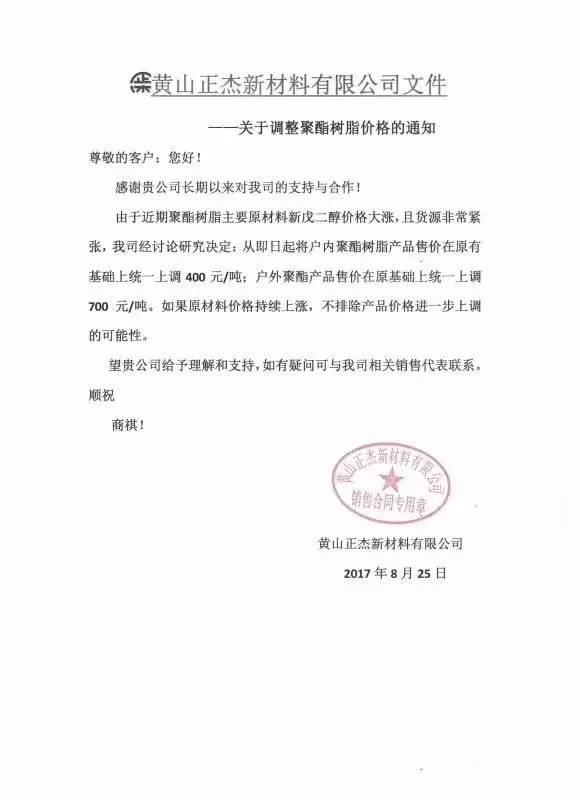 與此同時,受原材料新戊二醇上漲的影響,黃山正杰新材料有限公司發下漲價函,表示其戶內聚酯樹脂產品售價在原有基礎上統一上調400元/噸,戶外聚酯產品售價在原基礎上統一上調700元/噸。