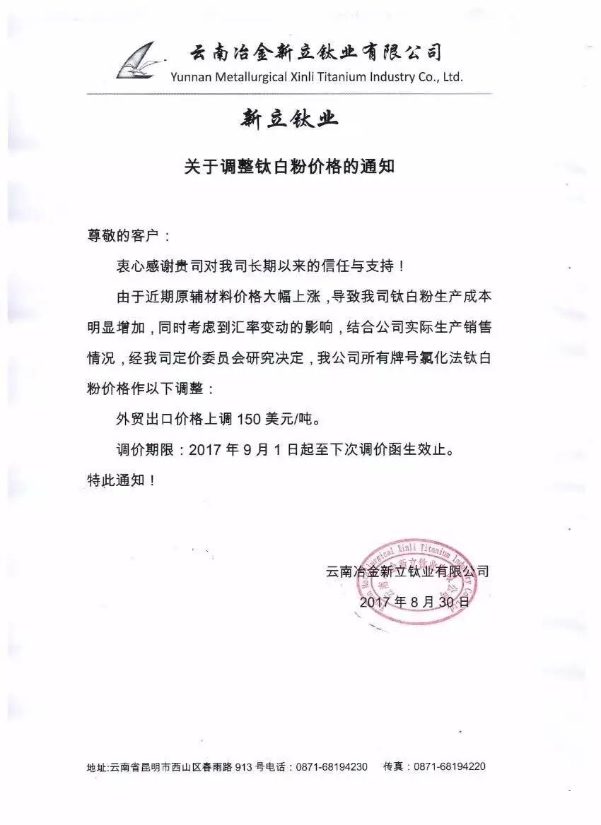 云南冶金新立鈦業有限公司,8月30日發布漲價通知,決定9月1日起,氯化法鈦白粉外貿出口價格上調150美元/噸。