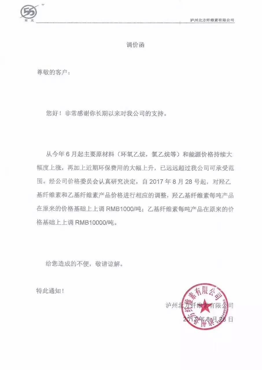 瀘州北方纖維素有限公司,8月28日,也下發漲價通知函,決定自8月28日起,對羥乙基纖維素和乙基纖維素產品價格進行相應的調整,羥乙基纖維素每噸產品在原來的價格基礎上上調RMB1000元/噸,乙基纖維素每噸產品在原來的價格基礎上上調RMB10000元/噸。