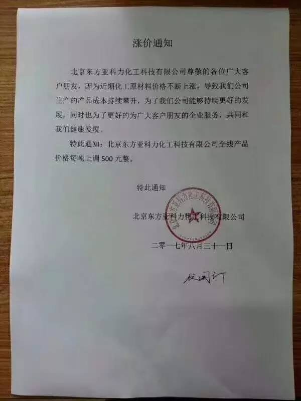 北京東方亞科力化工科技有限公司8月31日宣布其全線產(chǎn)品價(jià)格每噸上調(diào)500元整。