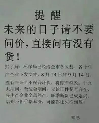 有錢未必能買到貨,各種漲價、限產(chǎn)、停產(chǎn)現(xiàn)象已經(jīng)召示2017年是各行各業(yè)洗牌最殘酷的一年!近期第四批中央環(huán)保督察開始,8個督察組已陸續(xù)進駐。中央第二環(huán)境保護督察組和中央第三環(huán)境保護督察組分別入駐浙江省和山東省,召開督查工作動員會,督查時間為一個月。環(huán)保督察將進一步促進“散亂污”企業(yè)的關(guān)停,以及環(huán)保設(shè)備不完善企業(yè)的升級改造和整治,從而催生助推企業(yè)整治潮的來臨。