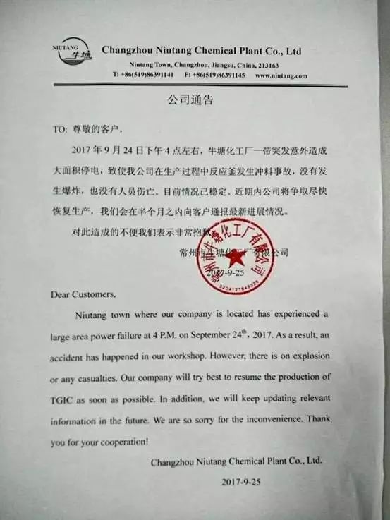 據(jù)中國涂料采購網(wǎng)了解,牛塘化工的TGIC在國內(nèi)市場中占有很大比例,在國內(nèi)安全檢查的高壓之下,作為國內(nèi)涂料助劑行業(yè)的龍頭企業(yè),卻出現(xiàn)如此嚴(yán)重的安全事故。實屬不應(yīng)該,早在2016年11月15日,區(qū)安監(jiān)局曹雄偉局長赴常州市牛塘化工廠有限公司進(jìn)行督查時,明確指出企業(yè)要切實履行安全生產(chǎn)主體責(zé)任,認(rèn)真做好重大危險源的辨識評估、登記建檔、申報備案、檢測監(jiān)控、警示告知、應(yīng)急演練等工作,不斷提高安全管理水平。鎮(zhèn)安監(jiān)科也會加大監(jiān)管力度,督促企業(yè)把安全生產(chǎn)主體責(zé)任落到實處。還不一年的時間,牛塘化工就發(fā)生了如此嚴(yán)重的安全事故。
