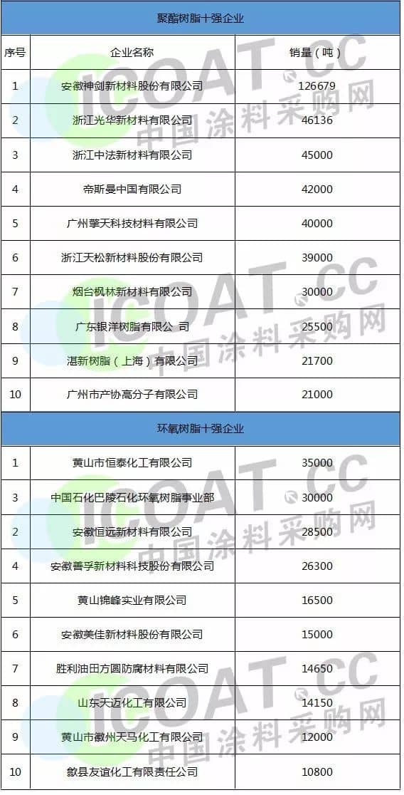 【中國涂料采購網】近兩年以來,在環保的影響之下,很多地區陸續出臺“禁油令”,很多中小型涂料企業逐步轉向粉末涂料行業,進一步推動了國內粉末涂料行業的發展,對聚酯樹脂和環氧樹脂的需求量進一步增大。中國涂料采購網對各大樹脂企業進行實地調研,并通過粉末涂料企業進一步了解國內各大樹脂企業的發展狀況。根據各大樹脂企業2016年銷量進行排名,具體名單如下表所示。