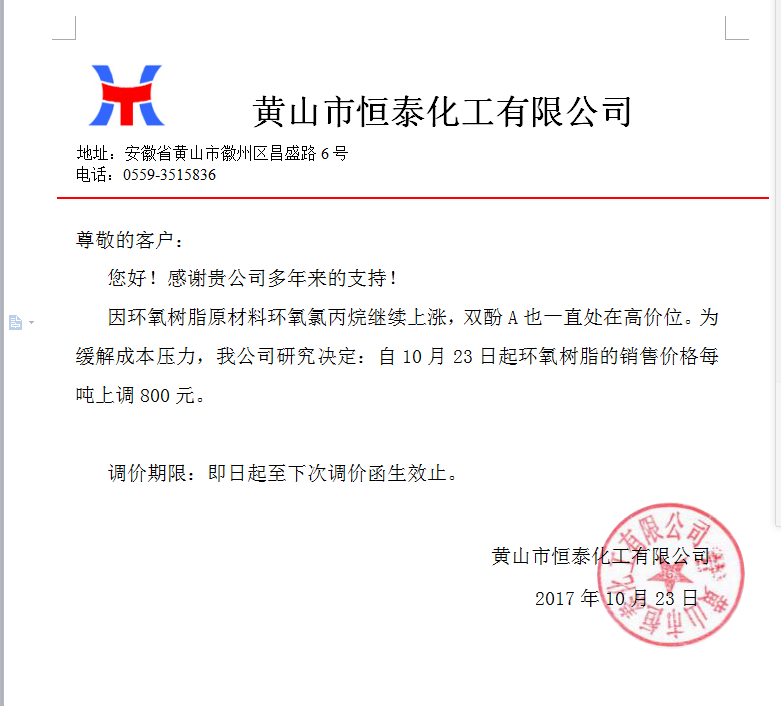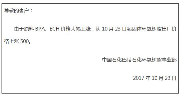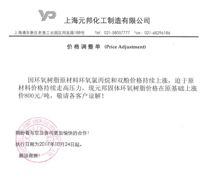 10月23日、24日兩天內,山東海力化工有限公司環氧氯丙烷報價直接上漲1000元/噸,華東報價13200元/噸送到,華南報價13500元/噸送到。中國石化巴陵石化固體環氧樹脂每噸上漲500元,黃山市恒泰化工有限公司環氧樹脂每噸上漲800元/噸,友誼化工環氧樹脂每噸上漲600元。上海元邦化工制造公司固體環氧樹脂每噸上漲800元。