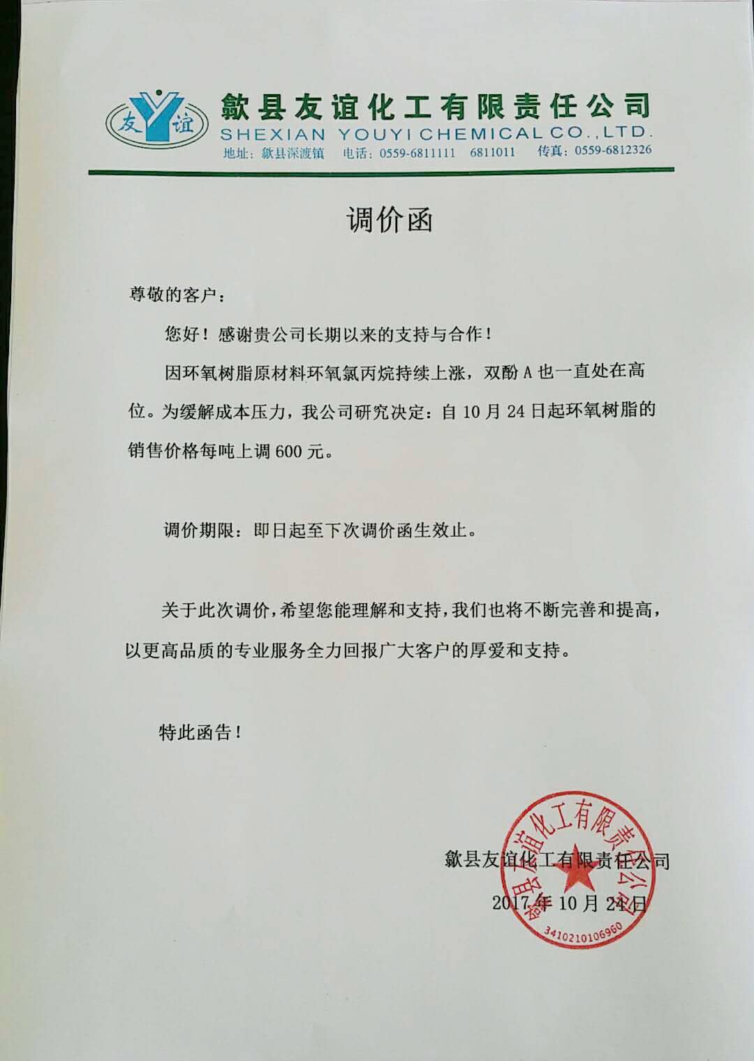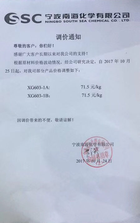 原材料企業漲價通知