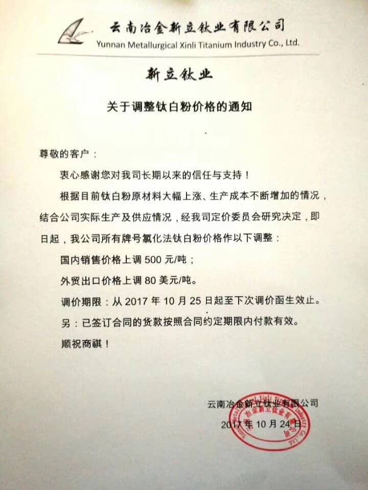 鈦白粉企業漲價通知