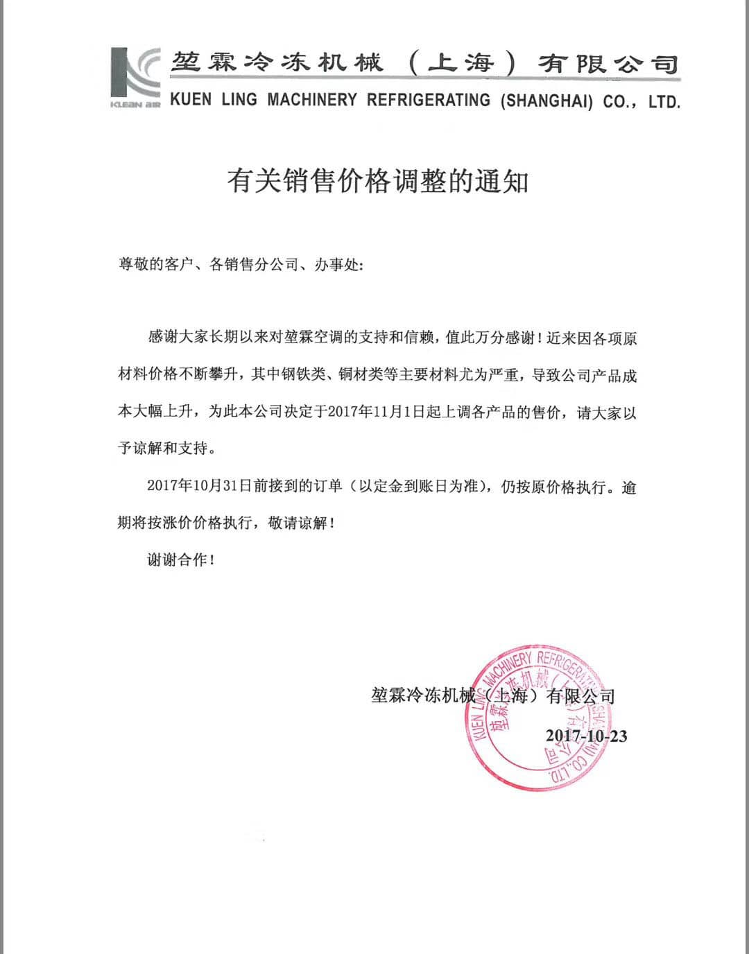 涂料生產制冷設備企業漲價通知