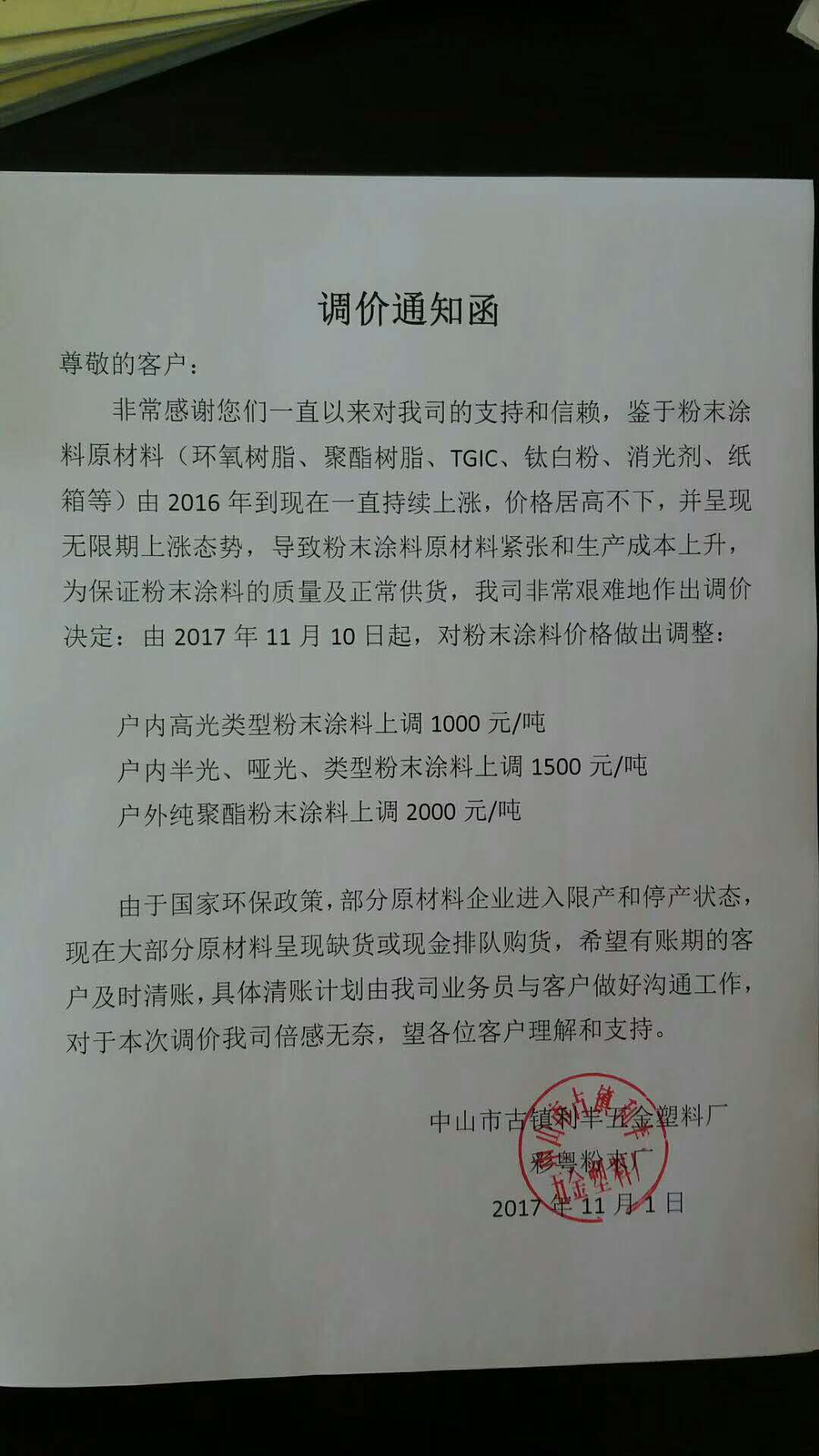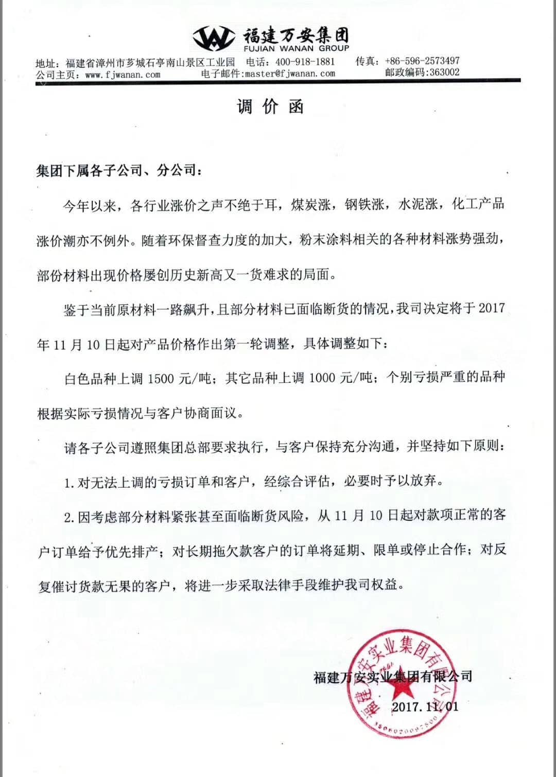 據中國涂料采購網了解,11月1日,國內粉末涂料行業龍頭企業福建萬安集團等粉末涂料企業宣布上調粉末涂料價格,上調幅度為1000元/噸-2000元/噸左右。另外據中國涂料采購網了解,國內部分化工園區因為環保問題進行限產,會導致國內環氧樹脂價格進一步上漲。業內人士透漏,國內環氧樹脂將會達到19000元/噸,至于漲勢能夠持續多長時間,主要取決于上游原材料價格的走勢。