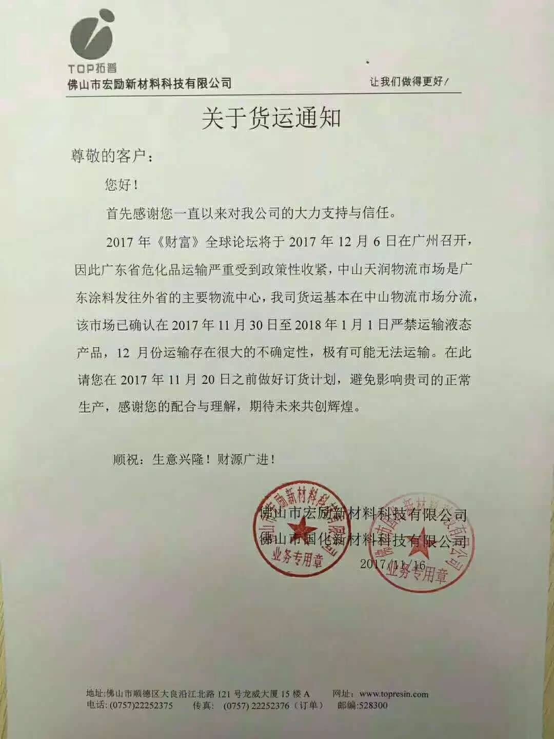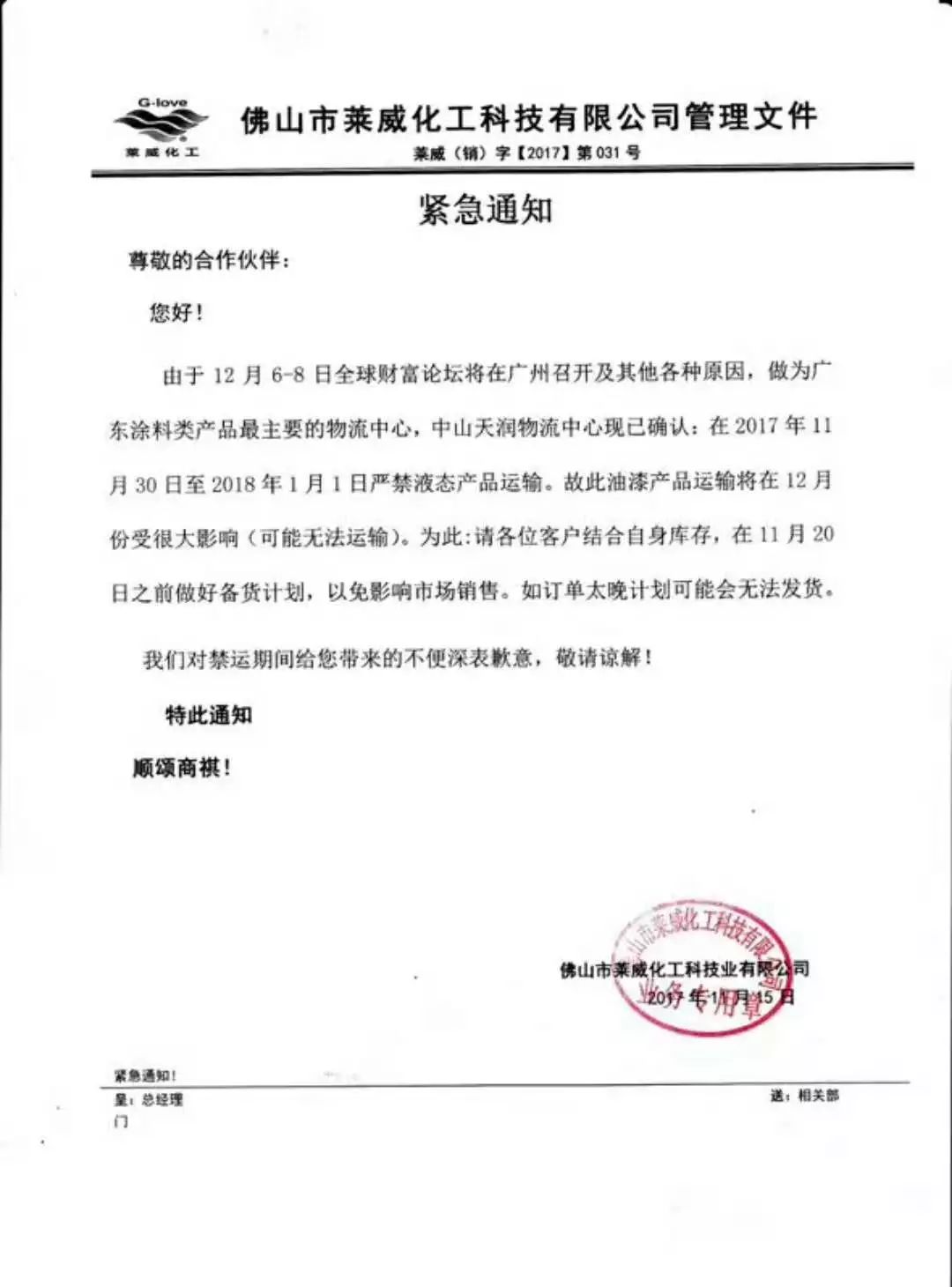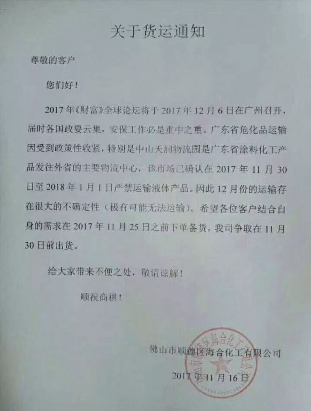【中國涂料采購網】由于12月6日-8日全球財富論壇將在廣州召開及其他各種原因,在2017年11月30日至2018年1月1日嚴禁液態(tài)產品運輸。截止11月21日,廣東地區(qū)多家涂料企業(yè)集體下發(fā)了緊急通知,提醒客戶做好庫存準備。 廣東是我國涂料第一大省,共集聚2000多家涂料企業(yè),此次時長1個月的禁運,將對華南地區(qū)的原材料、五金、家具、家電等行業(yè)造成重大影響。
