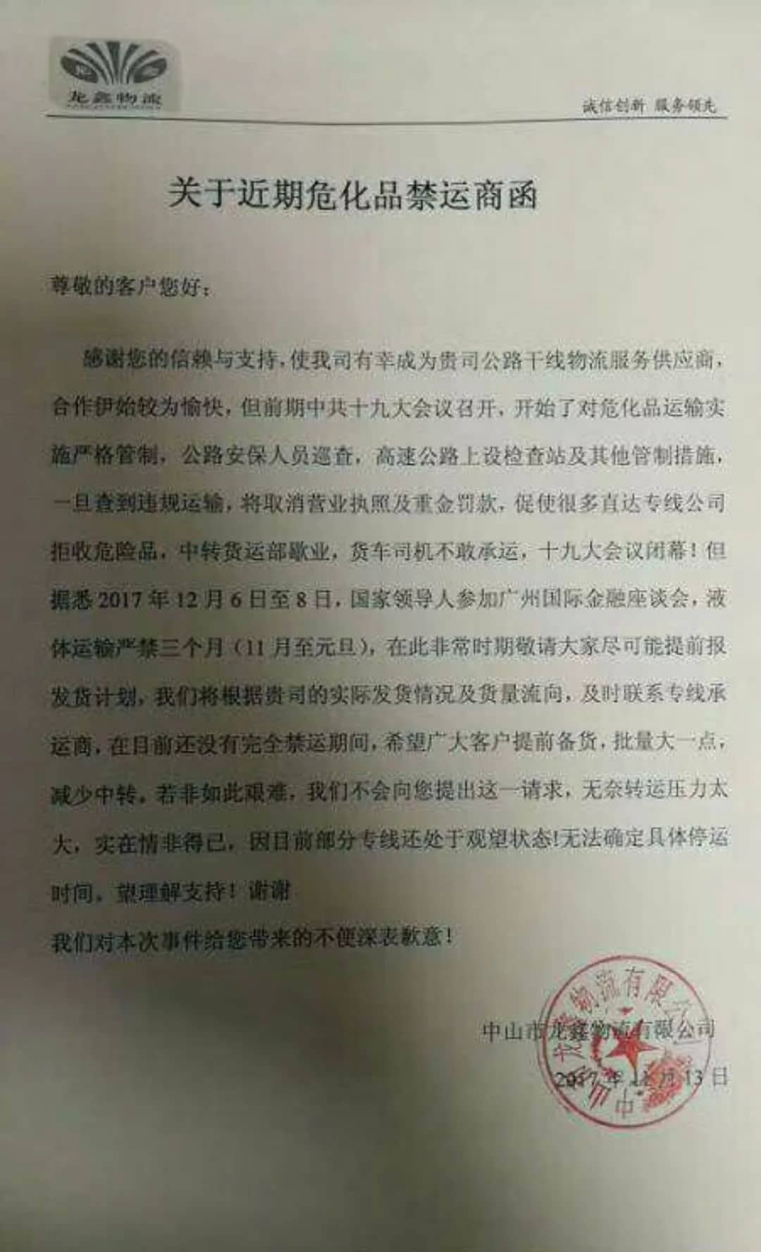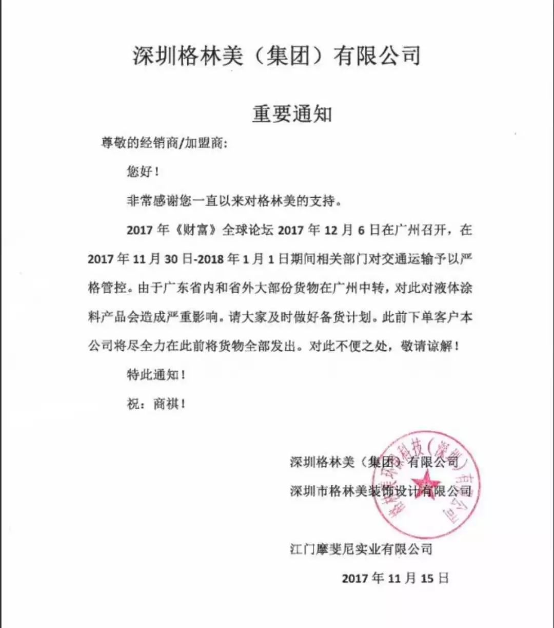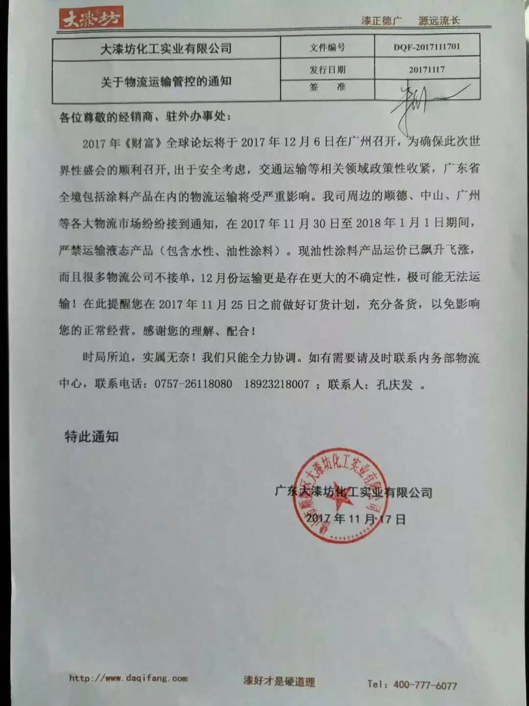 【中國涂料采購網】由于12月6日-8日全球財富論壇將在廣州召開及其他各種原因,在2017年11月30日至2018年1月1日嚴禁液態(tài)產品運輸。截止11月21日,廣東地區(qū)多家涂料企業(yè)集體下發(fā)了緊急通知,提醒客戶做好庫存準備。 廣東是我國涂料第一大省,共集聚2000多家涂料企業(yè),此次時長1個月的禁運,將對華南地區(qū)的原材料、五金、家具、家電等行業(yè)造成重大影響。