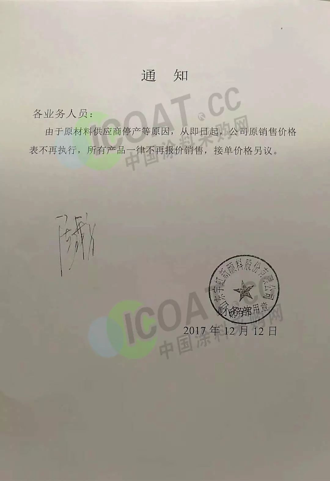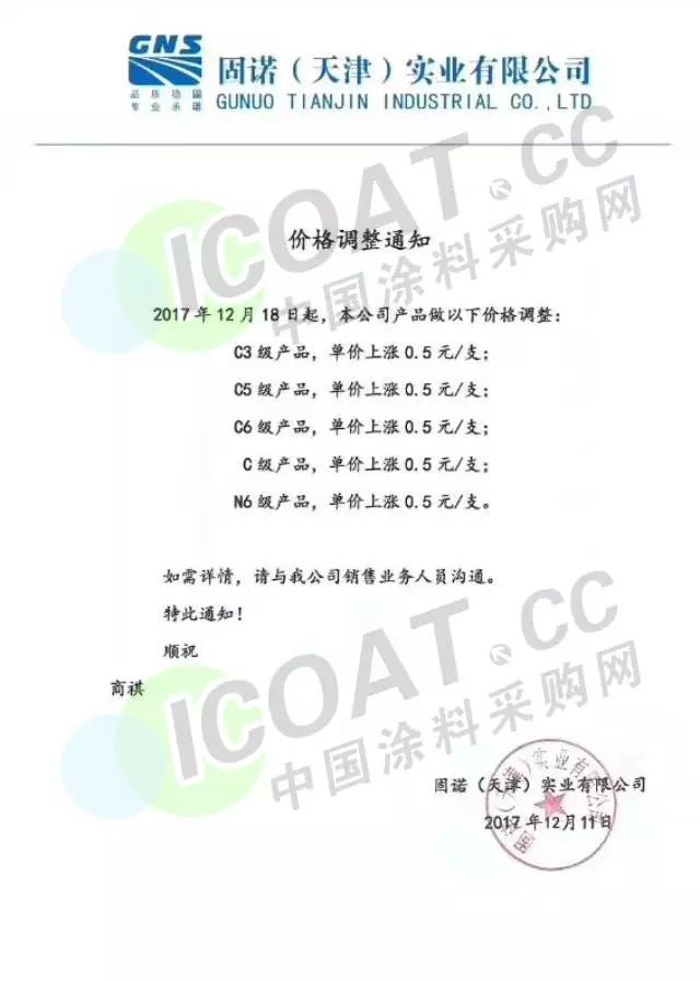 固諾(天津)實(shí)業(yè)有限公司下發(fā)價(jià)格調(diào)整通知:2017年12月18日起,其產(chǎn)品做價(jià)格調(diào)整。