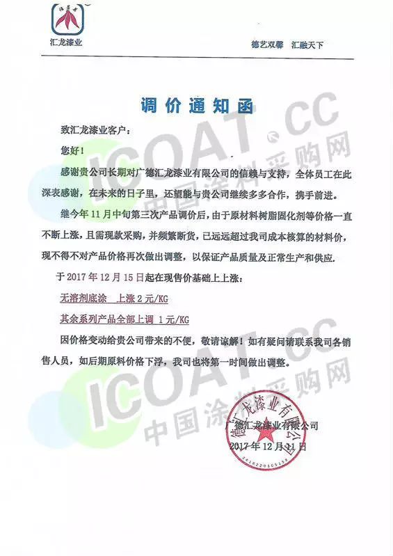 廣德匯龍漆業(yè)有限公司下發(fā)調(diào)價(jià)通知函:于2017年12月15日起在現(xiàn)售價(jià)基礎(chǔ)上上漲,無溶劑底涂上漲2元/KG,(合人民幣2000元/噸);其余系列產(chǎn)品全部上調(diào)1元/KG(合人民幣1000元/噸)。