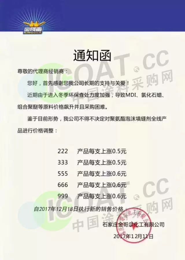 ? 石家莊金哥爾化工有限公司下發(fā)通知函:近期由于進(jìn)入冬季環(huán)保查處力度加強(qiáng),導(dǎo)致MDI、氯化石蠟、組合聚醚等原料價(jià)格飆升并且采購困難。鑒于目前形勢,不得不決定對聚氨酯泡沫填縫劑全線產(chǎn)品進(jìn)行價(jià)格調(diào)整。