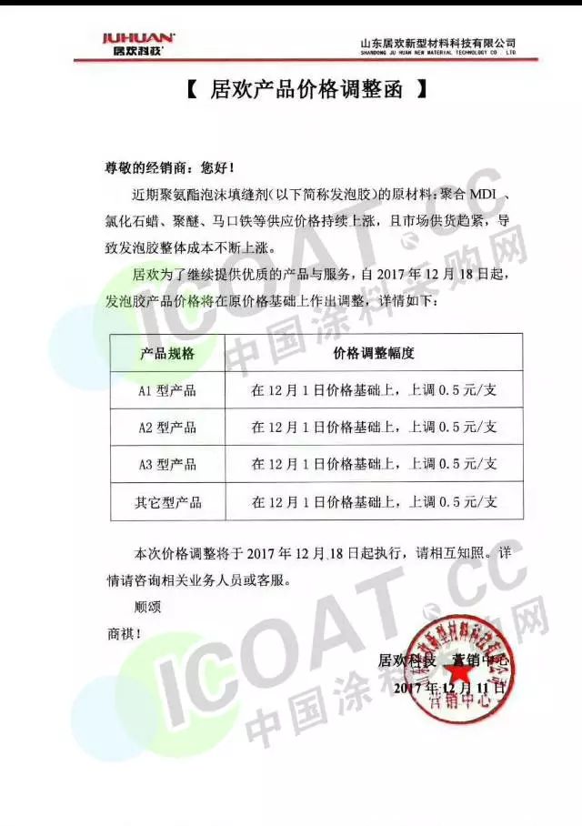山東居歡新材料科技有限公司下發(fā)價(jià)格調(diào)整函:自2017年12月18日起,發(fā)泡膠產(chǎn)品價(jià)格將在原價(jià)格基礎(chǔ)上作出調(diào)整。