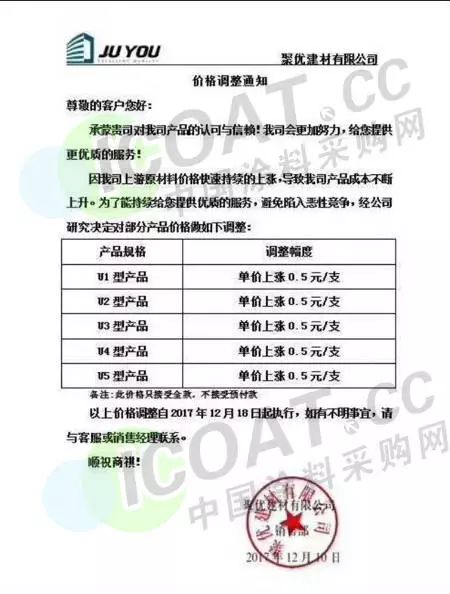 聚優(yōu)建材有限公司下發(fā)價(jià)格調(diào)整通知:因上游原材料價(jià)格快速持續(xù)的上漲,導(dǎo)致其產(chǎn)品成本不斷上升。為了能持續(xù)提供優(yōu)質(zhì)的服務(wù),避免陷入惡性競爭,經(jīng)公司研究決定對部分產(chǎn)品價(jià)格做如下調(diào)整。