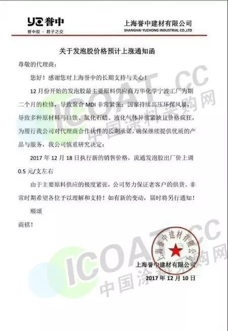 上海譽(yù)中建材有限公司下發(fā)關(guān)于發(fā)泡膠價(jià)格預(yù)計(jì)上漲通知函:12月份開始的發(fā)泡膠最主要原料供應(yīng)商萬華化學(xué)寧波工廠為期二個(gè)月的檢修,導(dǎo)致聚合MDI非常緊張:國家持續(xù)高壓環(huán)保風(fēng)暴,導(dǎo)致多種原材料馬口鐵、氯化石蠟、液化氣體異常緊缺且價(jià)格瘋狂。為履行對代理商合作伙伴的長期承諾,確保繼續(xù)提供優(yōu)質(zhì)的產(chǎn)品與服務(wù),公司慎重研究決定:2017年12月18日執(zhí)行新的銷售價(jià)格,流通發(fā)泡膠出廠價(jià)格上調(diào)0.5元/支左右。