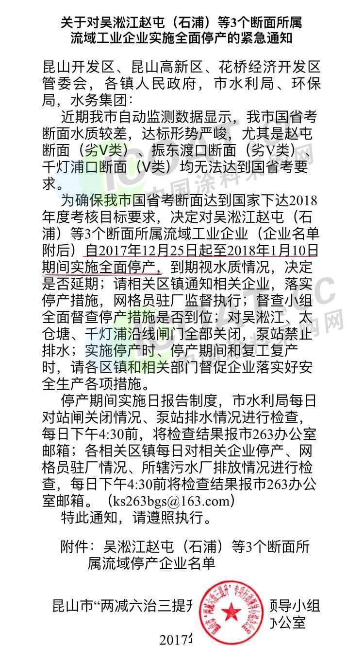 日前,江蘇省一則《關于對吳淞江趙屯(石浦)等3個斷面所屬流域工業企業實施全面停產的緊急通知》(以下簡稱《通知》)刷爆行業各大微信群以及朋友圈,像是一顆重磅炸彈在業內炸開了!《通知》要求該市范圍內的270家企業全面停產。