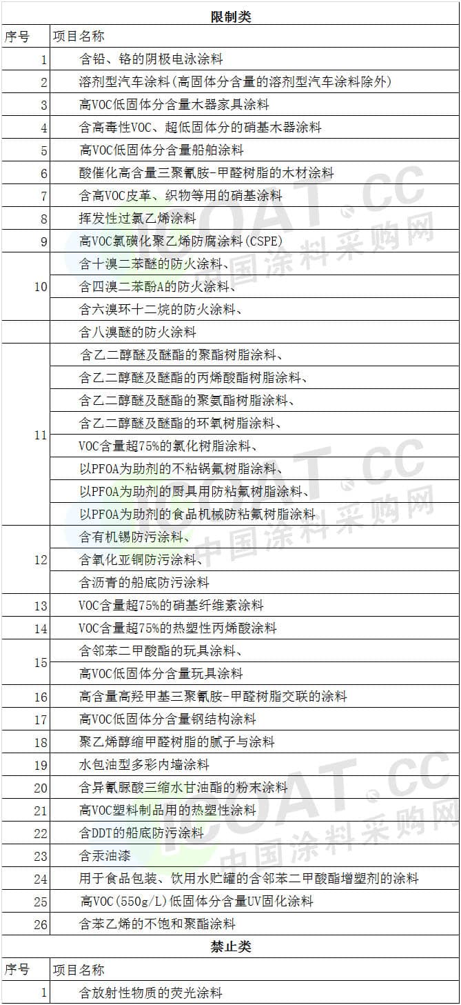 連云港市化工產業建設項目環境準入負面清單—限制類、禁止類涂料項目名單
