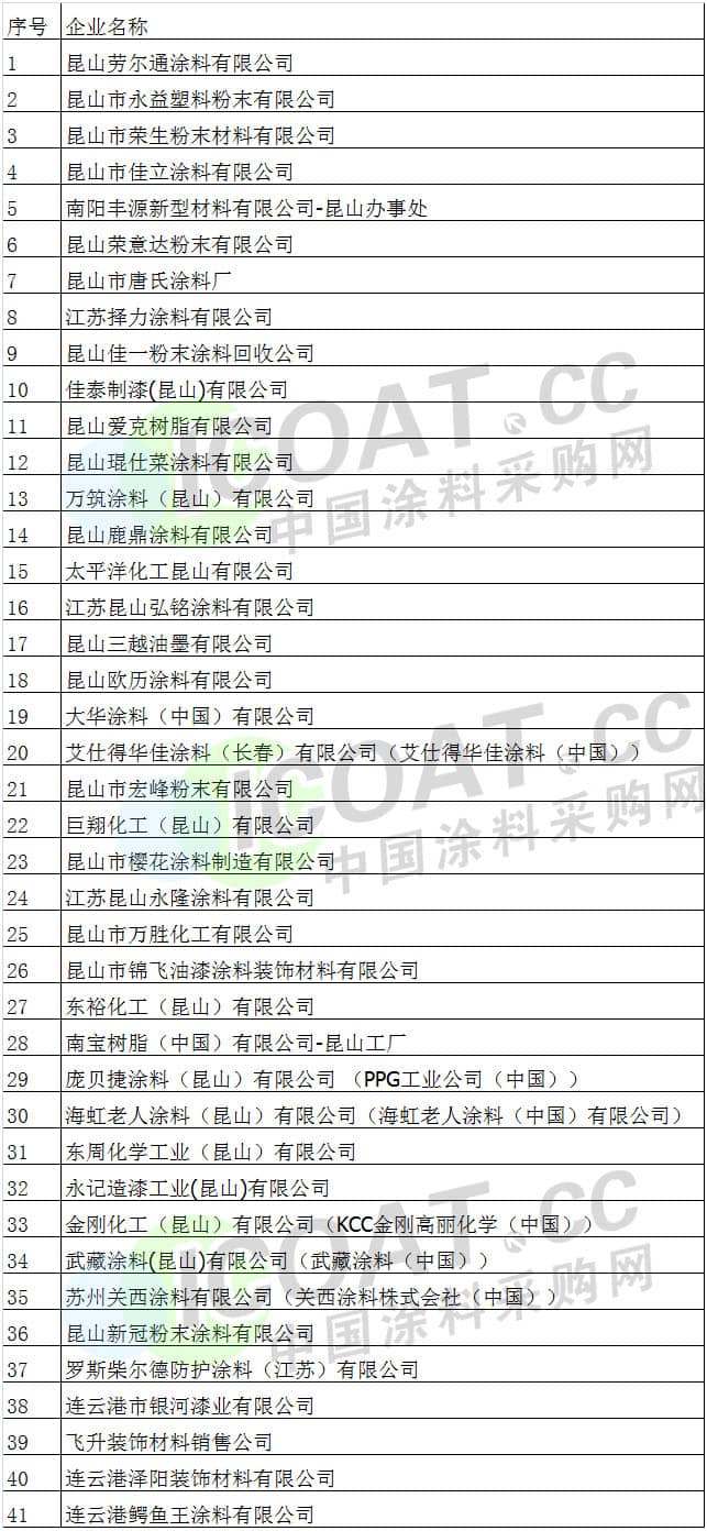 據中國涂料采購網信息中心消息,江蘇昆山及連云港地區部分涂料企業名單如下: